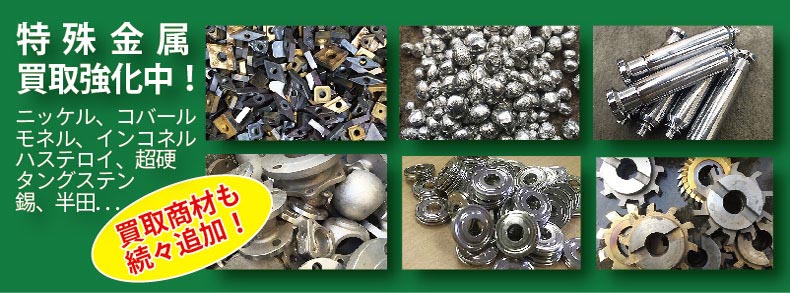 ニッケル・コバール・洋白・モネル・インコロイ・インコネル・ハステロイ・白銅・タングステン・超硬・サーメット・ハイス鋼・錫・半田・チタン・モリブデン・自動車触媒等、高価買取中!